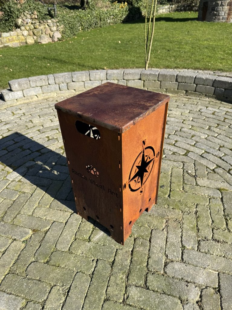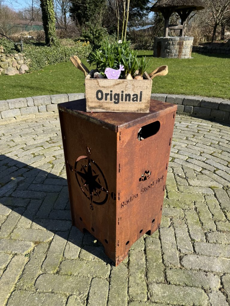Der Feuerkorb wird aus unbehandeltem Stahl gefertigt, der mit der Zeit eine natürliche Rostschicht entwickelt. Diese Patina ist ein gewollter Effekt und unterstreicht den rustikalen Charakter. Auf empfindlichen Böden können sich durch den Rost Abfärbungen bilden.