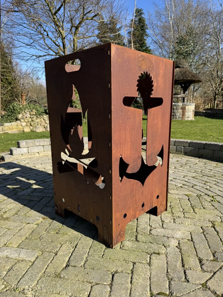 Der Feuerkorb besteht aus blankem Stahl und entwickelt im Freien mit der Zeit eine natürliche Rostpatina – für einen markanten Vintage-Look im rustikalen Stil.